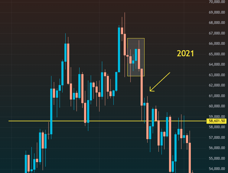 Here the drops are much faster and stronger — in other words, no room for meaningful recovery. That marked rectangle is where we are right now, and if today’s rally turns out to be a fakeout, we’re heading into another liquidation cascade 💀.