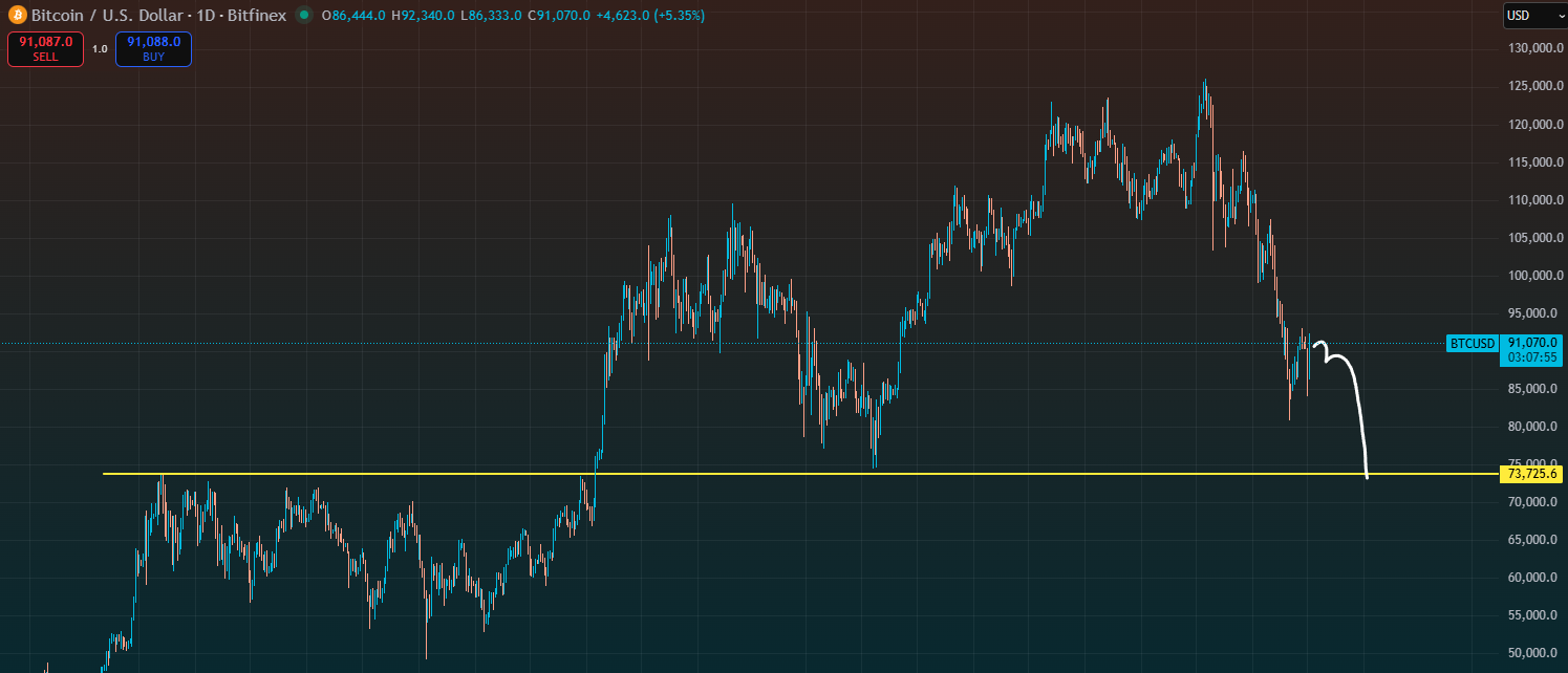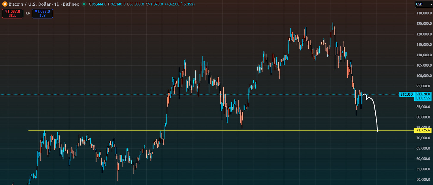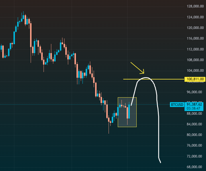 Why exactly 100k? Because it’s a psychological barrier that the chart likely won’t break — the bull market is over. If it weren’t, I’d be calling for a supercycle and another bear market in 10 years 😄.