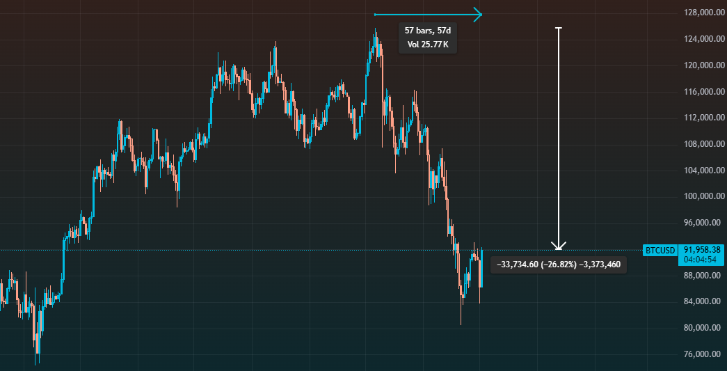 Alright, so where are we? We’re exactly 57 days past the end of the calendar bull market and around -26% from the ATH, which was once again hit precisely on its final day. Looking at this, you could say the bear market has already begun — and that’s also my view.